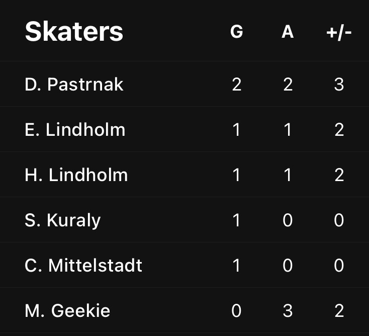 Oliver Kapanen – 1 G (9), -2, 3 SOG, 1 BLK, and 16:24 TOI. I pulled this kid’s card in my NHL25 HUT team last week. Let’s just say he can score a ton of goals…if you’re on the rookie or semi-pro setting vs the computer.