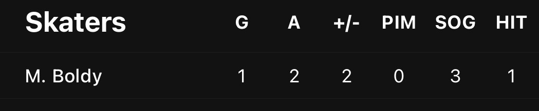 Macklin Celebrini – 2 A (33), 3 SOG. So, this game isn’t even done yet, and he’s sitting at 49 points. In 34 games. And it isn’t even Christmas yet. Oh……..Kay.